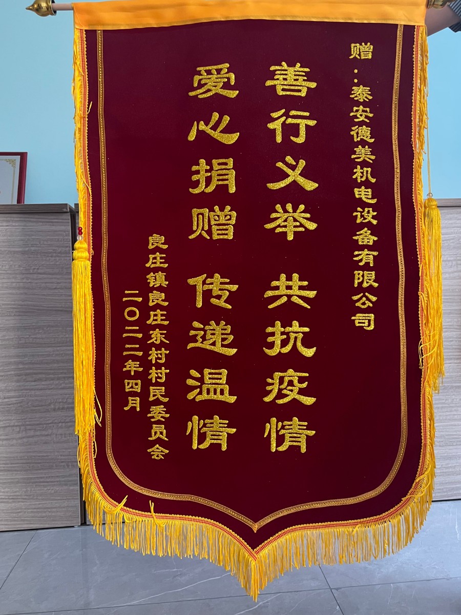 近日,良莊鎮(zhèn)良莊東村村民委員會將寫有“善行義舉,共抗疫情,愛心捐贈,傳遞溫情”的錦旗送到泰安德美機(jī)電設(shè)備有限公司,對本次抗擊疫情所做貢獻(xiàn)給予充分肯定!