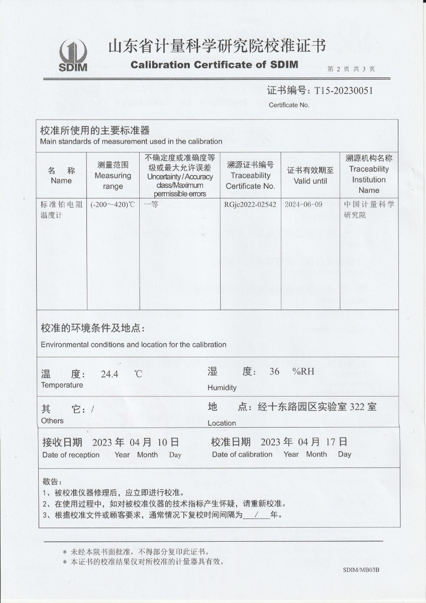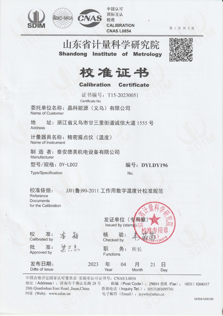 晶科能源(義烏)有限公司 精密露點儀(溫度)校準證書 2023-5-4 本文被閱讀 13664 次