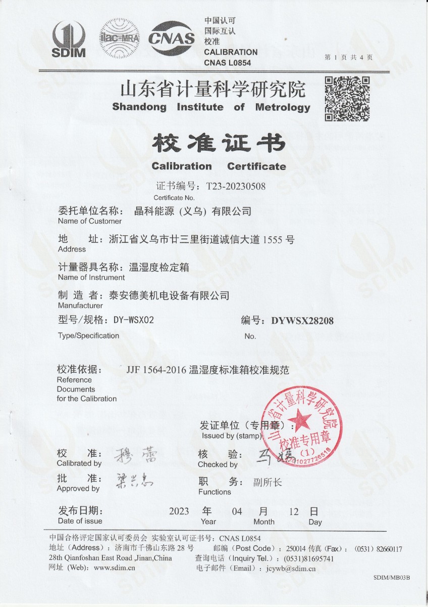 | 上一條:晶科能源(義烏)有限公司 精密露點(diǎn)儀(溫度)校準(zhǔn)證書 | 下一條:濕度發(fā)生器-校準(zhǔn)證書 |