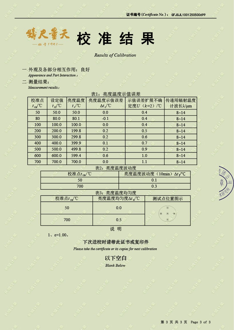| 上一條:腔式黑體輻射源(50-700℃)校準(zhǔn)證書 | 下一條:DY-HT2M-C高溫面源黑體爐(100mm) |
