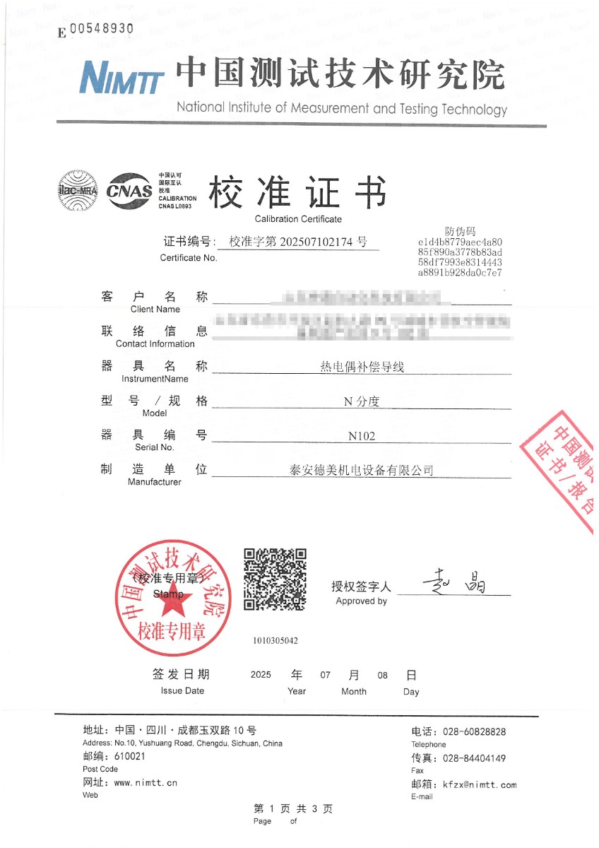 熱電偶補(bǔ)償導(dǎo)線(N分度)校準(zhǔn)證書 2025-7-10 本文被閱讀 3514 次