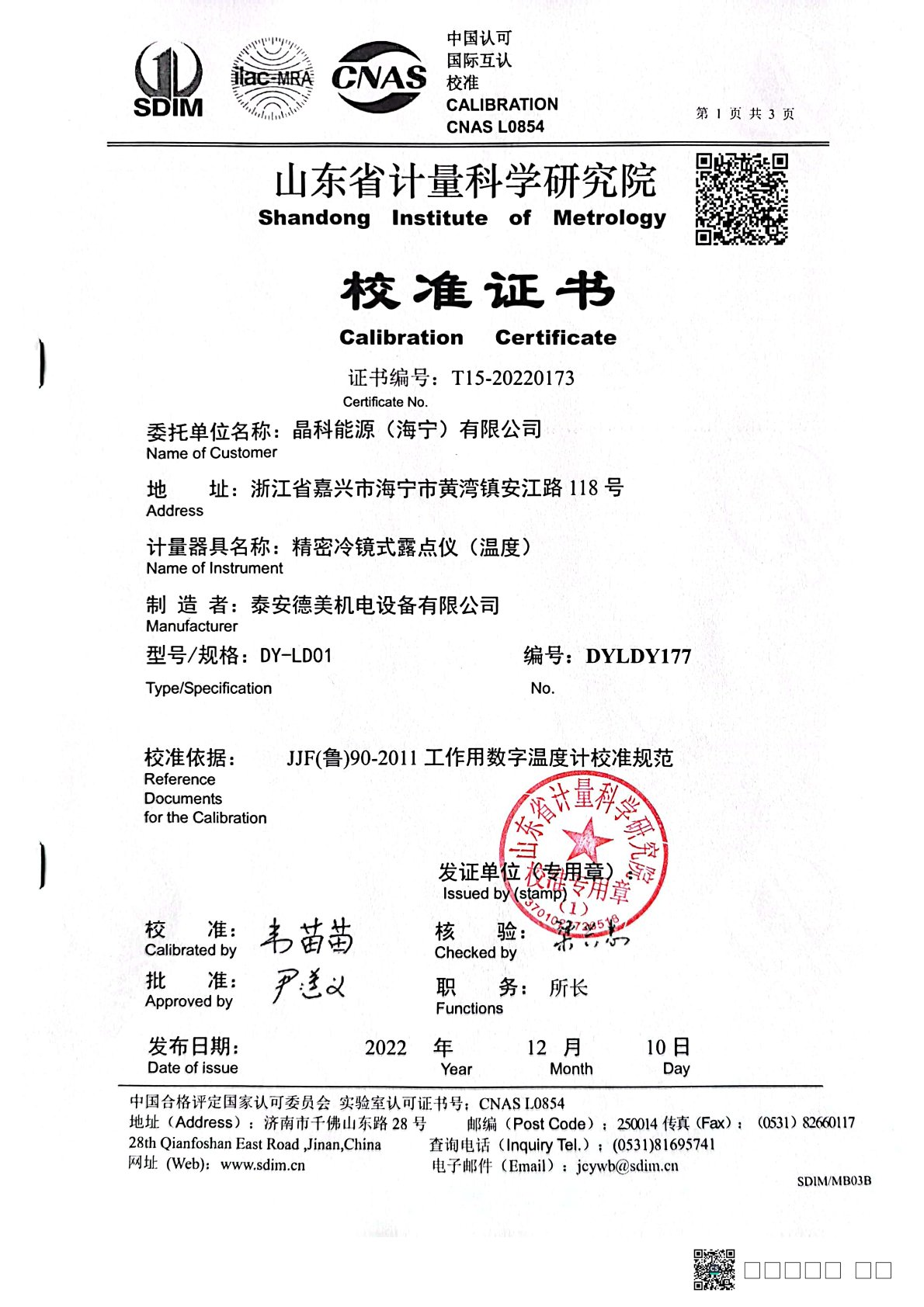| 上一條:晶科能源(海寧)有限公司 精密冷鏡式露點(diǎn)儀 檢定證書 | 下一條:濕度發(fā)生器-校準(zhǔn)證書 |