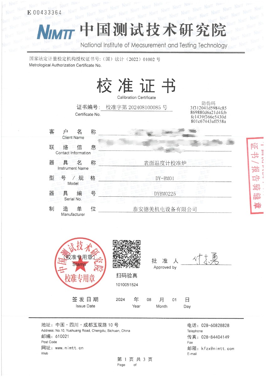 表面溫度計(jì)(室溫+5~400℃)校準(zhǔn)證書 2024-8-12 本文被閱讀 7814 次