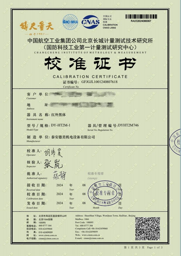 紅外黑體,室溫+5-300℃校準證書 2024-8-29 本文被閱讀 9056 次