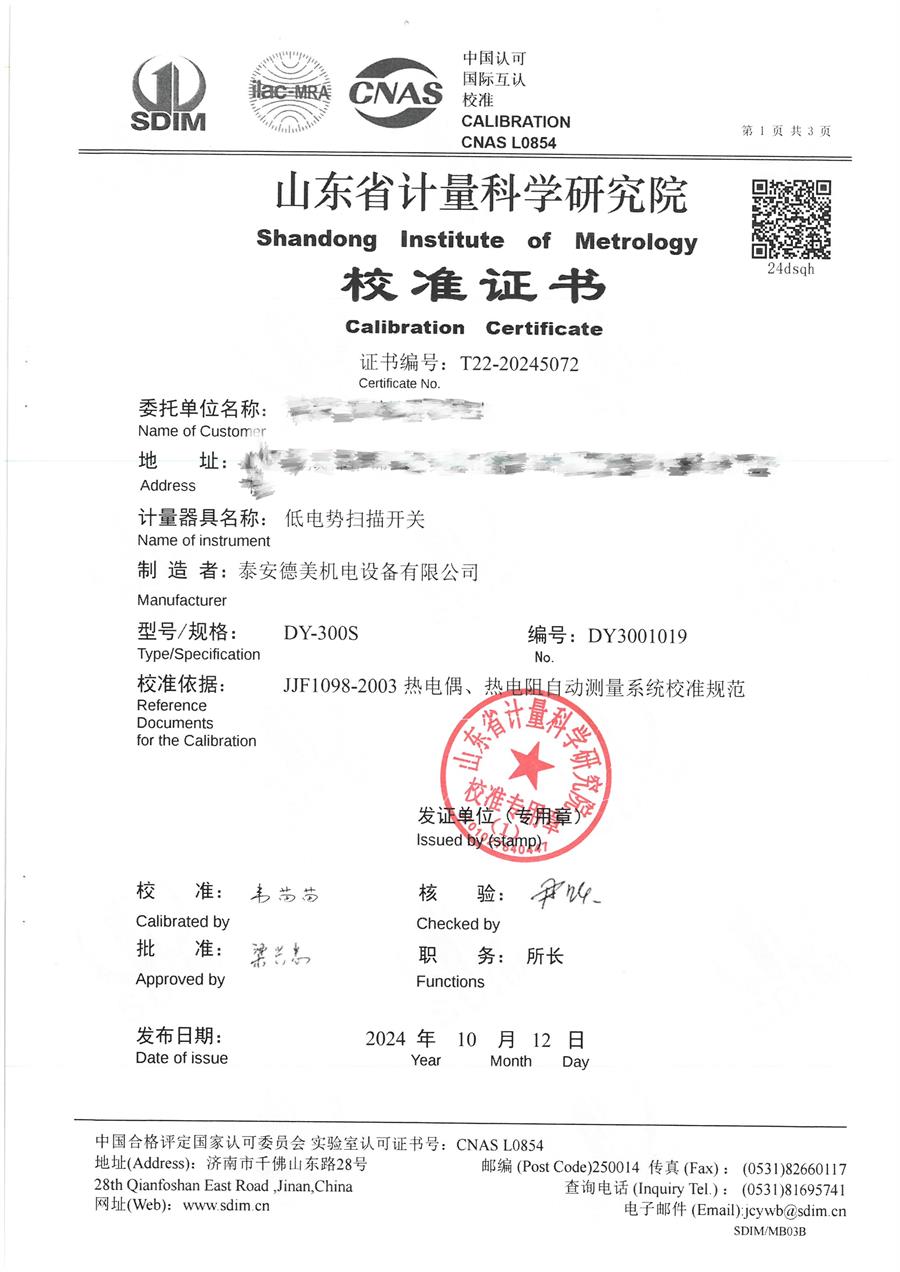 低電勢掃描開關(guān)校準證書
