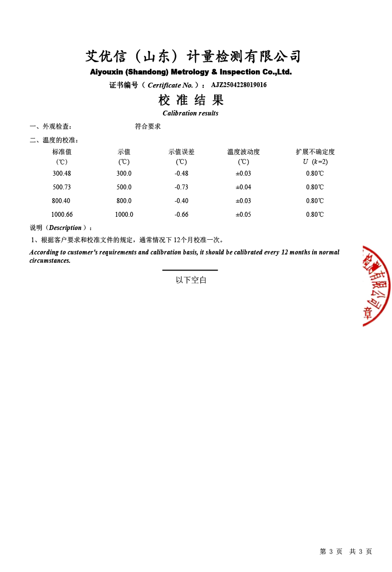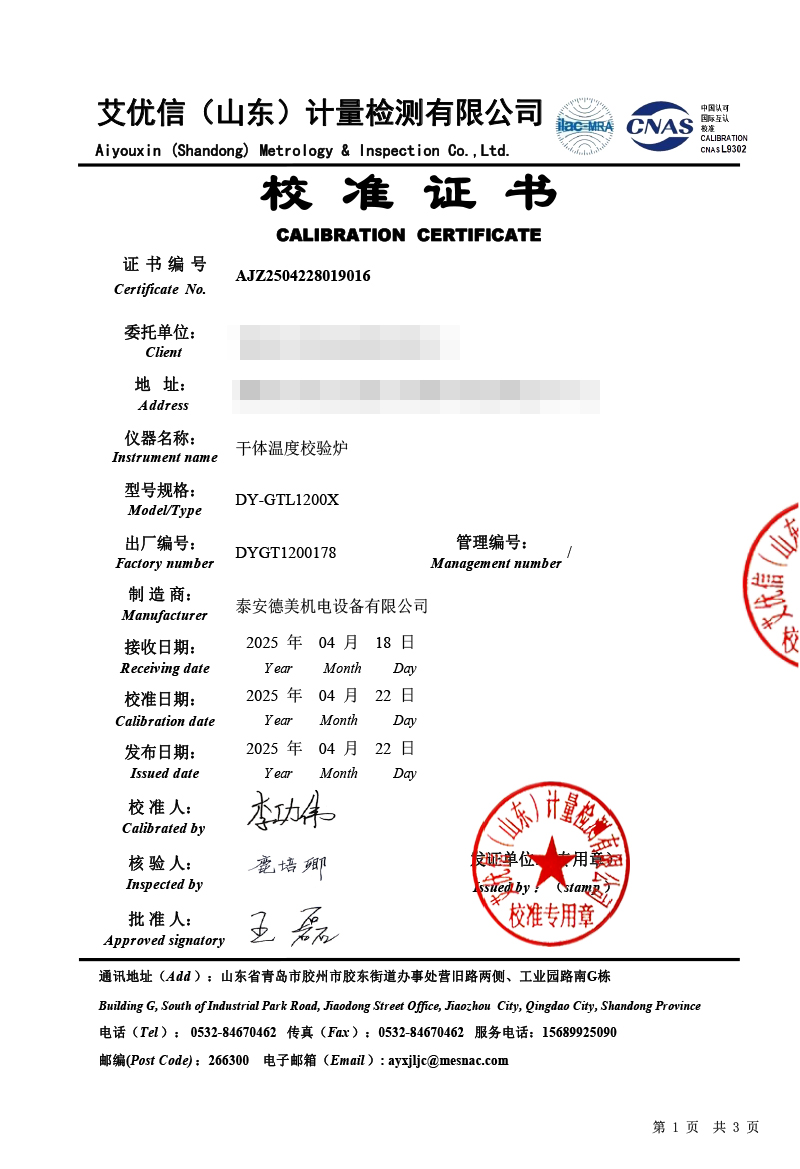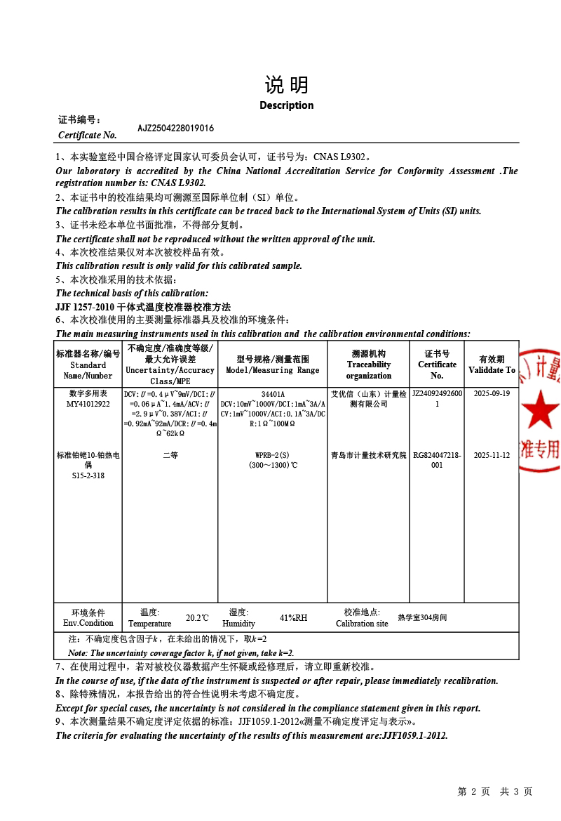 干體溫度校驗爐(300-1200℃)校準證書 2025-4-24 本文被閱讀 3951 次