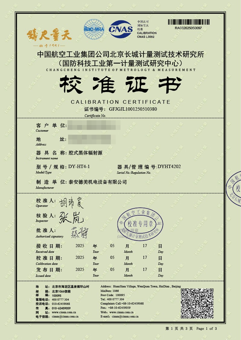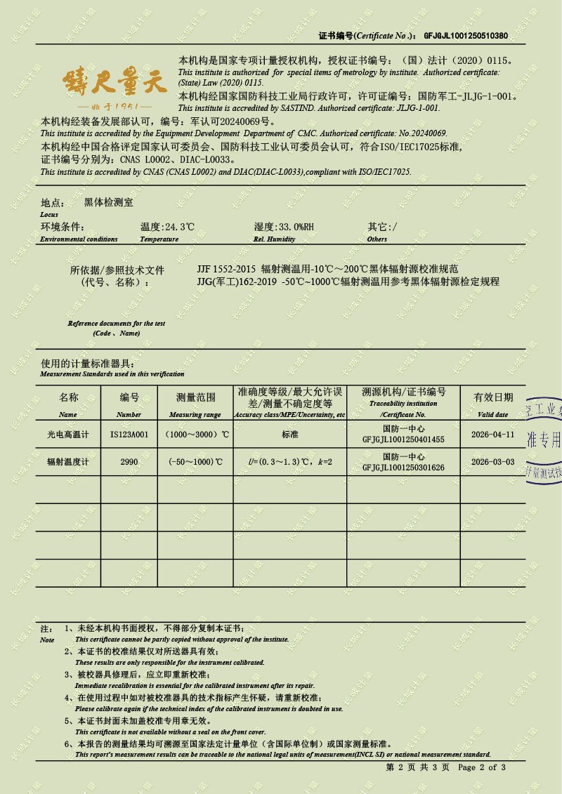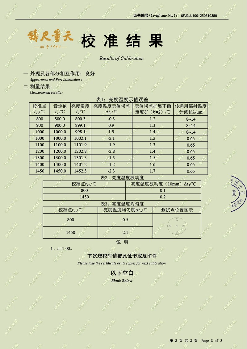 腔式黑體輻射源(800-1450℃)校準證書 2025-5-28 本文被閱讀 4103 次