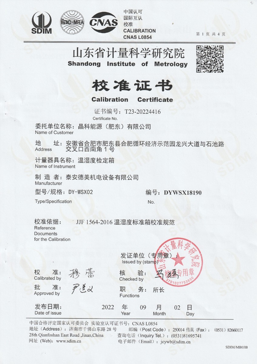 晶科能源(肥東)有限公司-溫濕度檢定箱 2022-9-15 本文被閱讀 17858 次