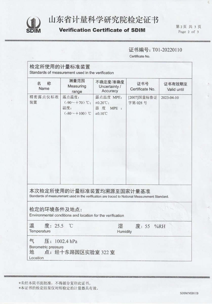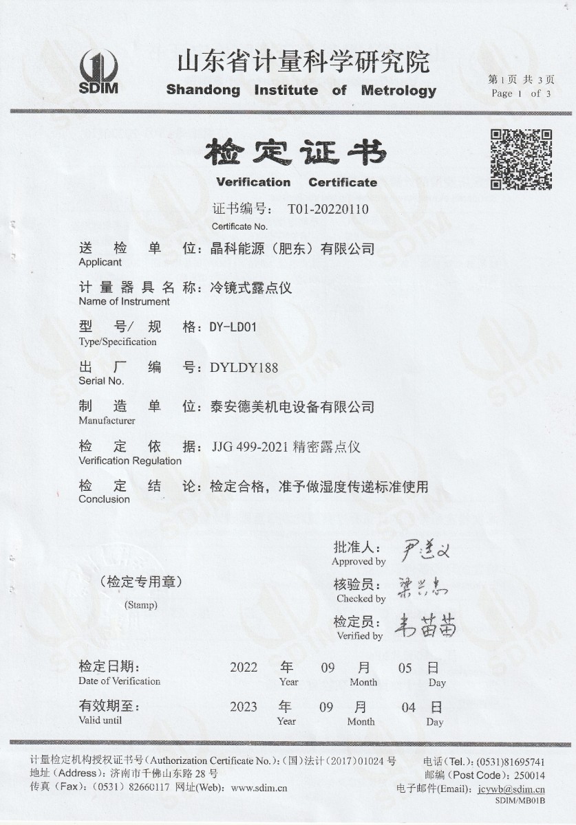 晶科能源(肥東)有限公司-冷鏡式露點儀檢定證書 2022-9-26 本文被閱讀 16943 次
