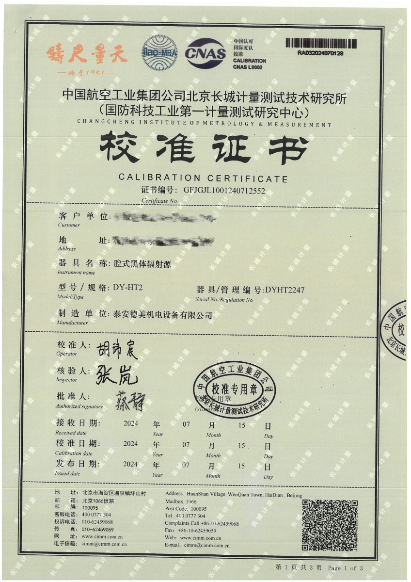 | 上一條:面源黑體爐(室溫+5℃~400℃)校準(zhǔn)證書 | 下一條:DY-HT2M-C高溫面源黑體爐(100mm) |