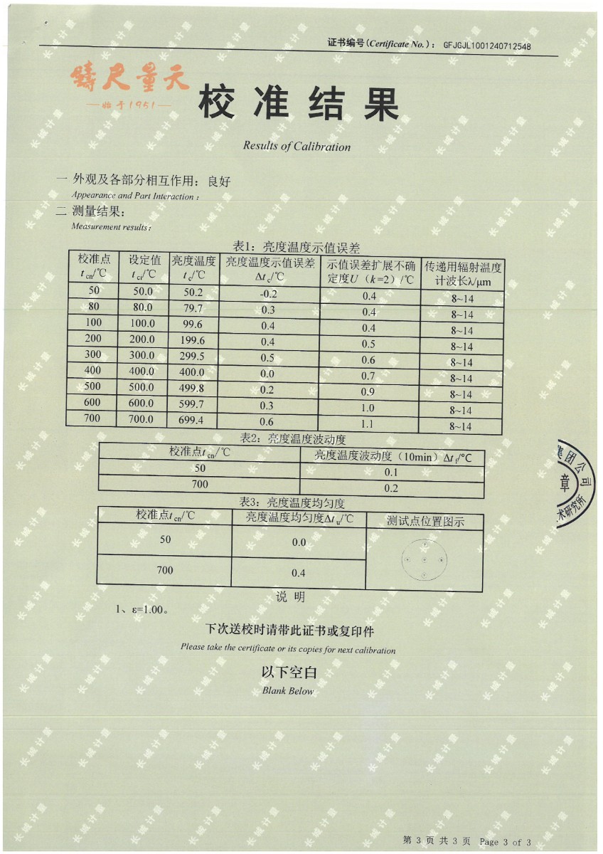 黑體(50~700℃)校準(zhǔn)證書 2024-7-29 本文被閱讀 10984 次