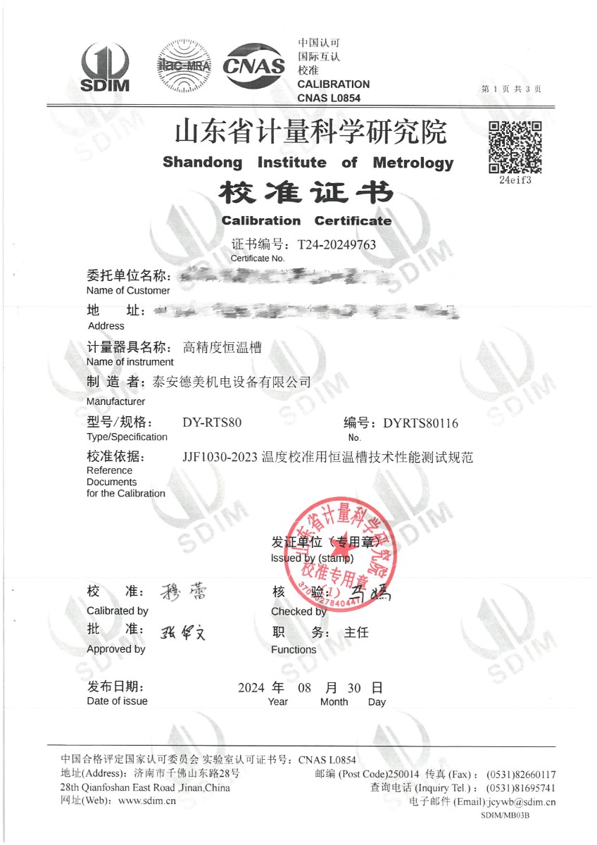 高精度恒溫槽(-80~100℃)校準證書 2024-9-3 本文被閱讀 6654 次