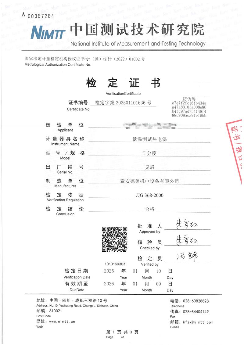 (T型)低溫測(cè)試熱電偶檢定證書 2025-1-13 本文被閱讀 6320 次