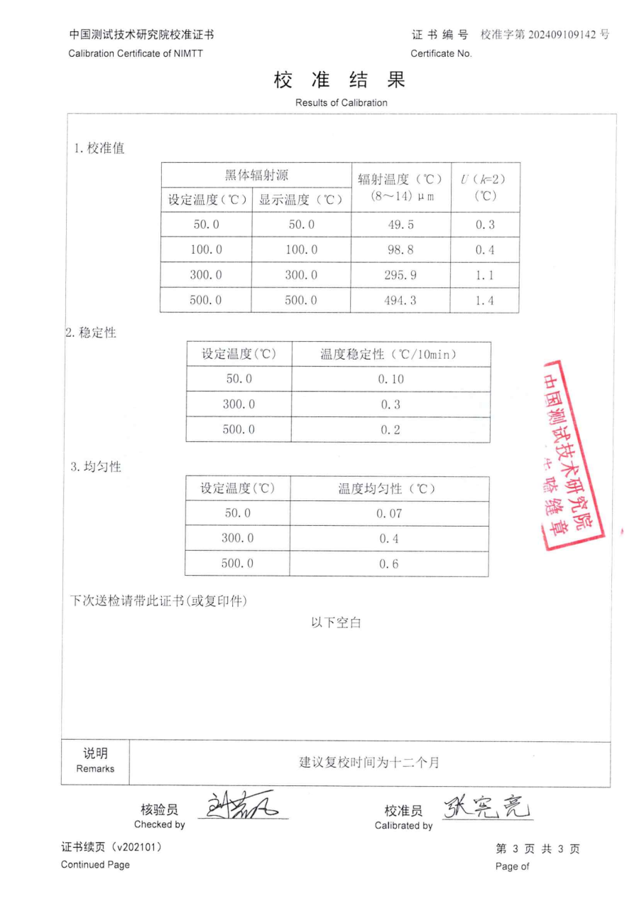 中溫腔式黑體校準(zhǔn)證書