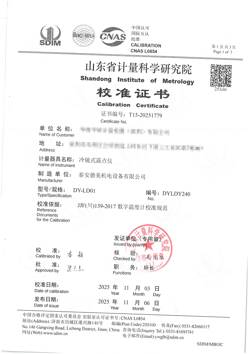 冷鏡式露點儀校準證書 2025-11-7 本文被閱讀 1923 次