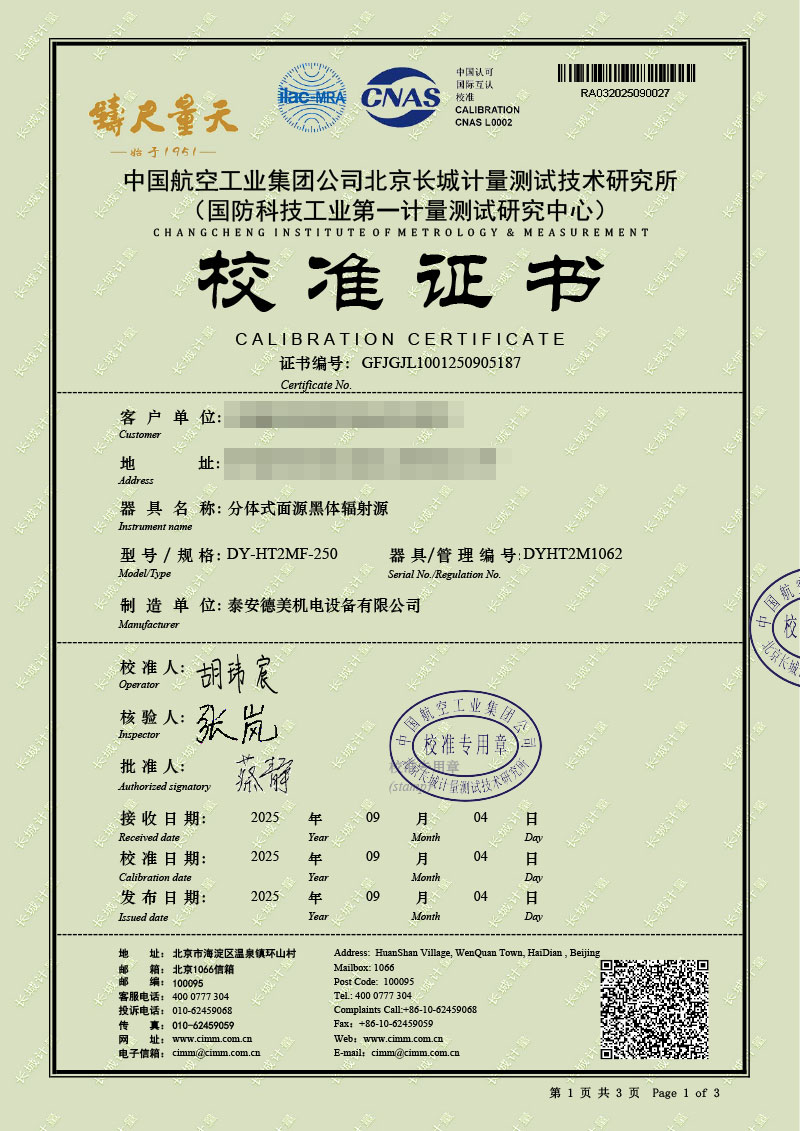 分體式面源黑體輻射源(室溫+5-300℃)校準證書 2025-9-12 本文被閱讀 2902 次