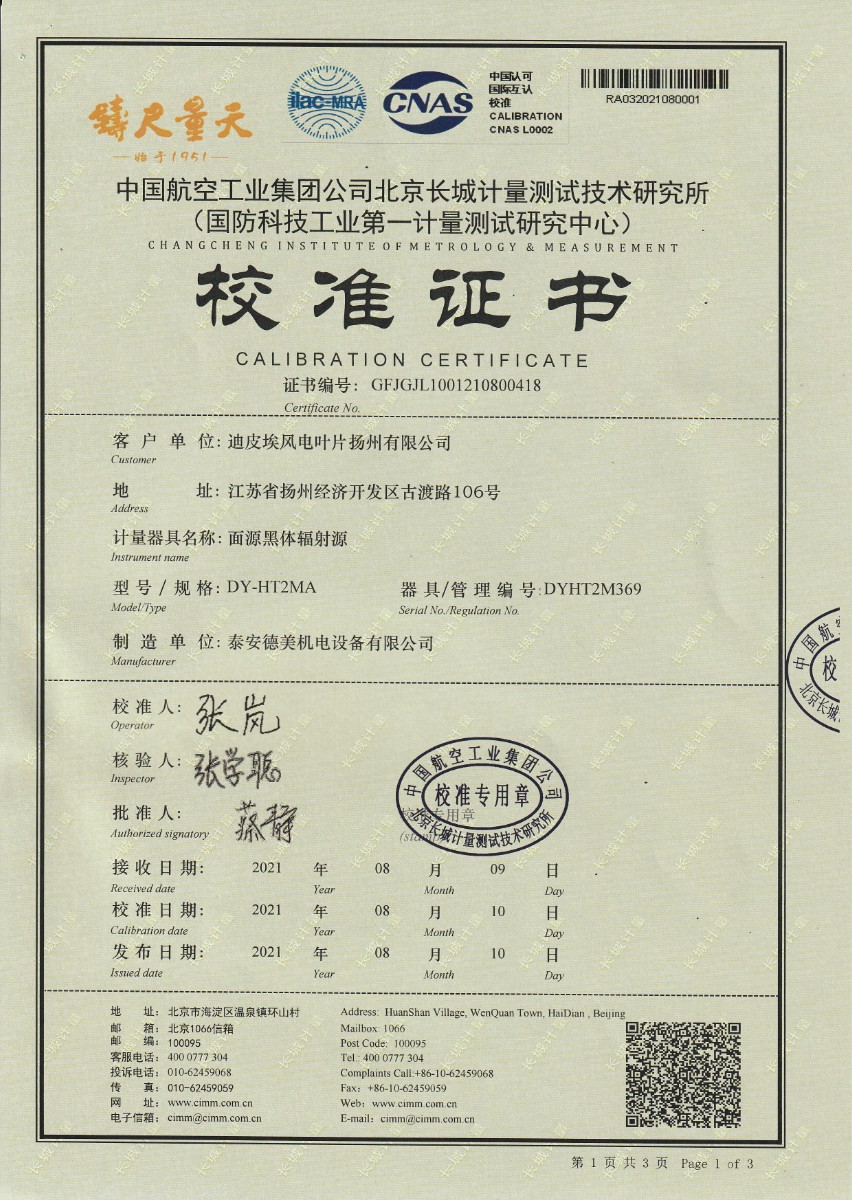 迪皮埃風(fēng)電葉片揚(yáng)州有限公司-面源黑體輻射源 2021-8-21 本文被閱讀 17335 次