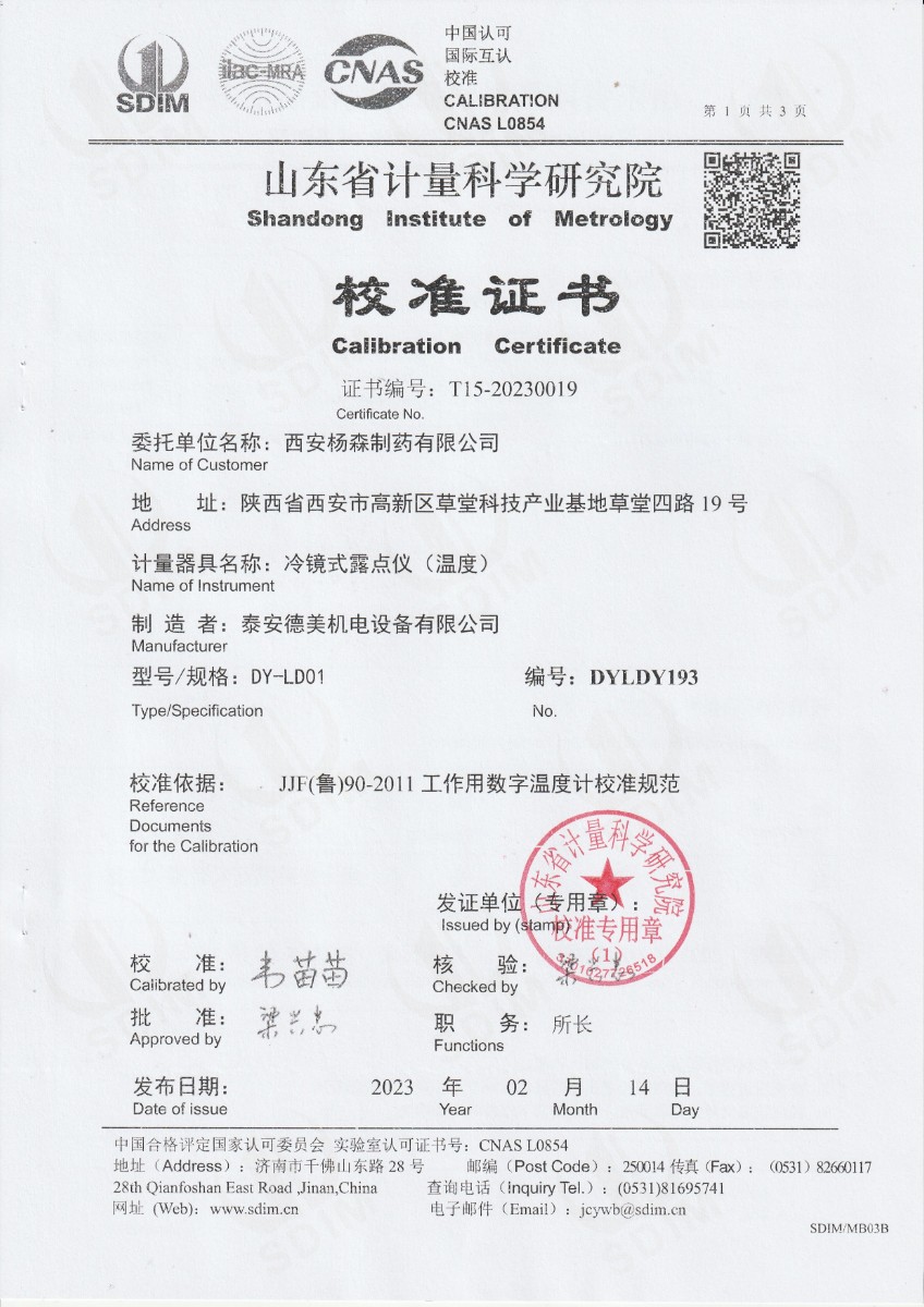 西安楊森制藥有限公司 冷鏡式露點儀(溫度) 校準證書 2023-2-25 本文被閱讀 13723 次
