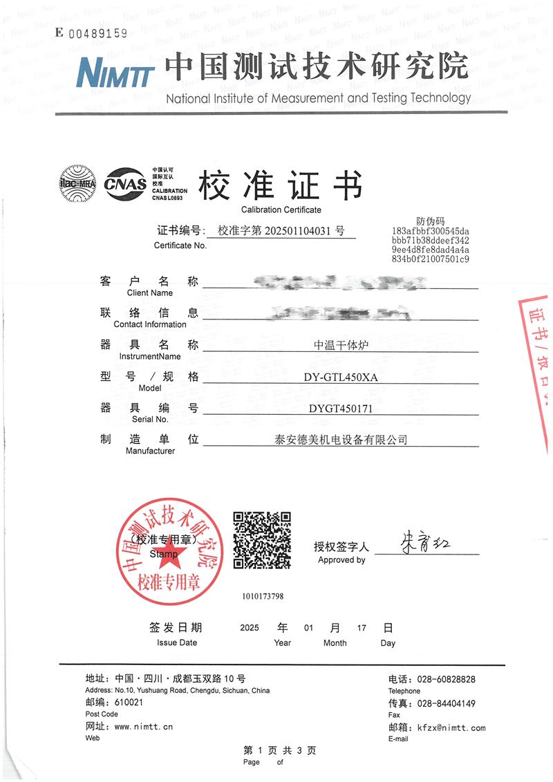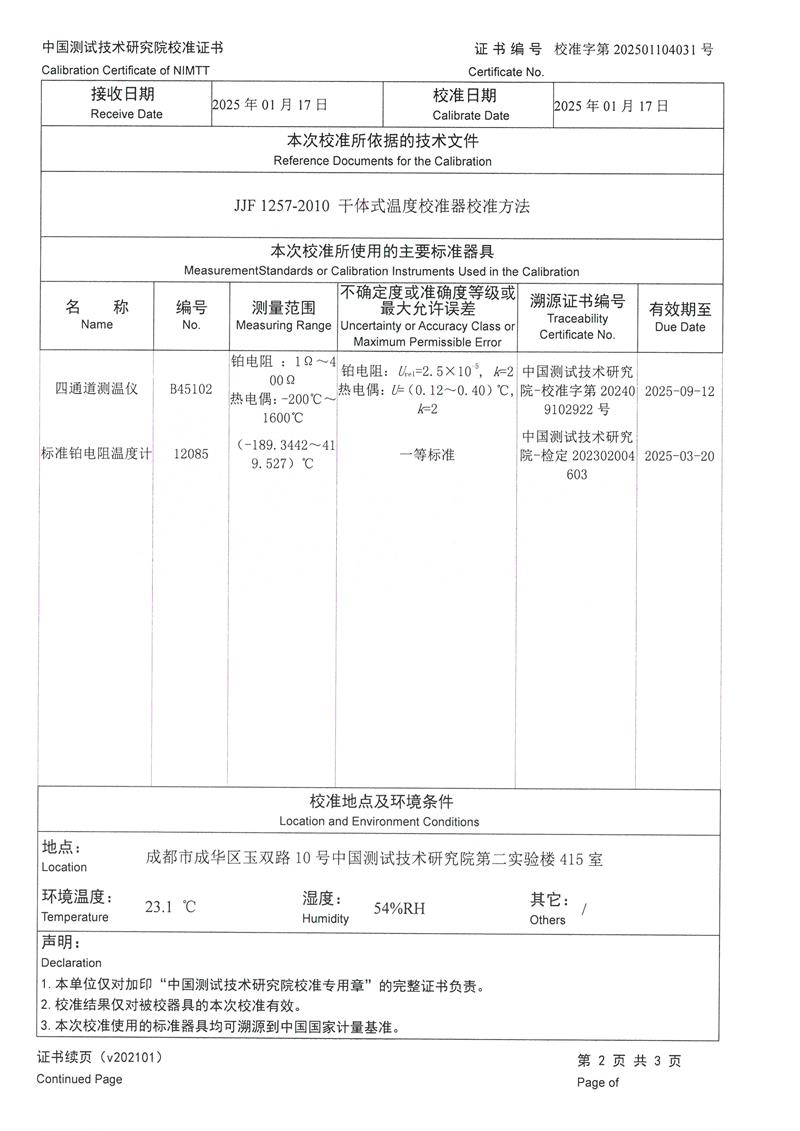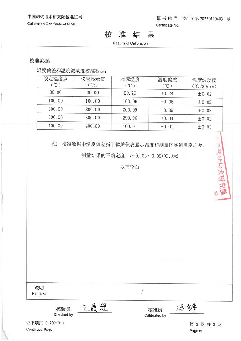 中溫干體爐(室溫+5~400℃)校準證書 2025-1-20 本文被閱讀 6192 次